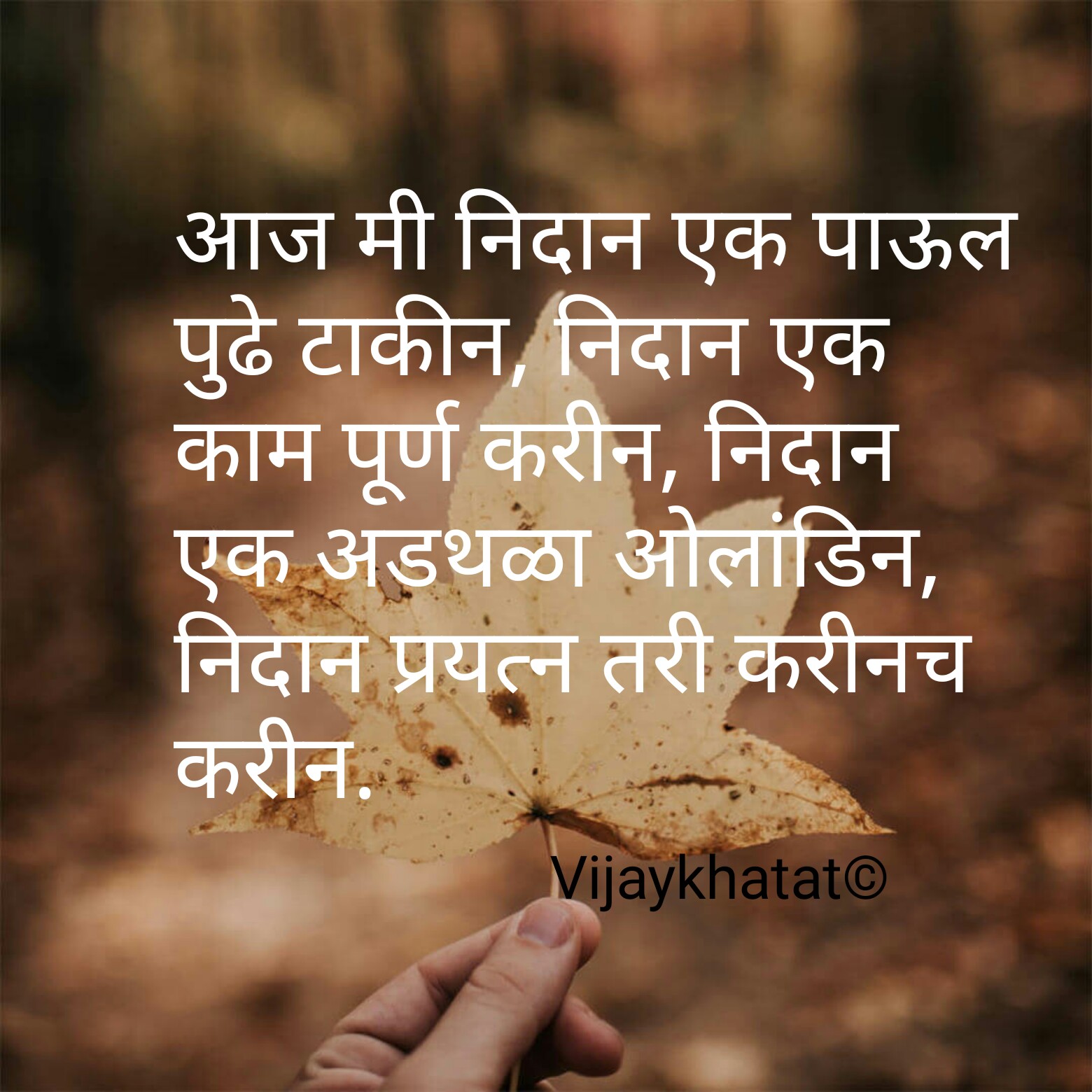 आज मी निदान एक पाऊल पुढे टाकीन, निदान एक काम पूर्ण करीन, निदानएक अडथळा ओलांडिन, निदान प्रयत्न तरी करीनच करीन. VijaykharatFebruary 20, 2021February 20, 2021Uncategorized Post navigation PreviousNext Like Loading...