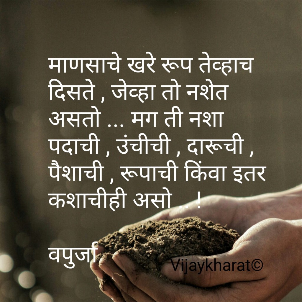 माणसाचे खरे रूप तेव्हाच दिसते , जेव्हा तो नशेत असतो … मग ती नशा पदाची , उंचीची , दारूची , पैशाची , रूपाची किंवा इतर कशाचीही असो .. ! वपुर्जा VijaykharatFebruary 21, 2021Uncategorized Post navigation Previous Like Loading...